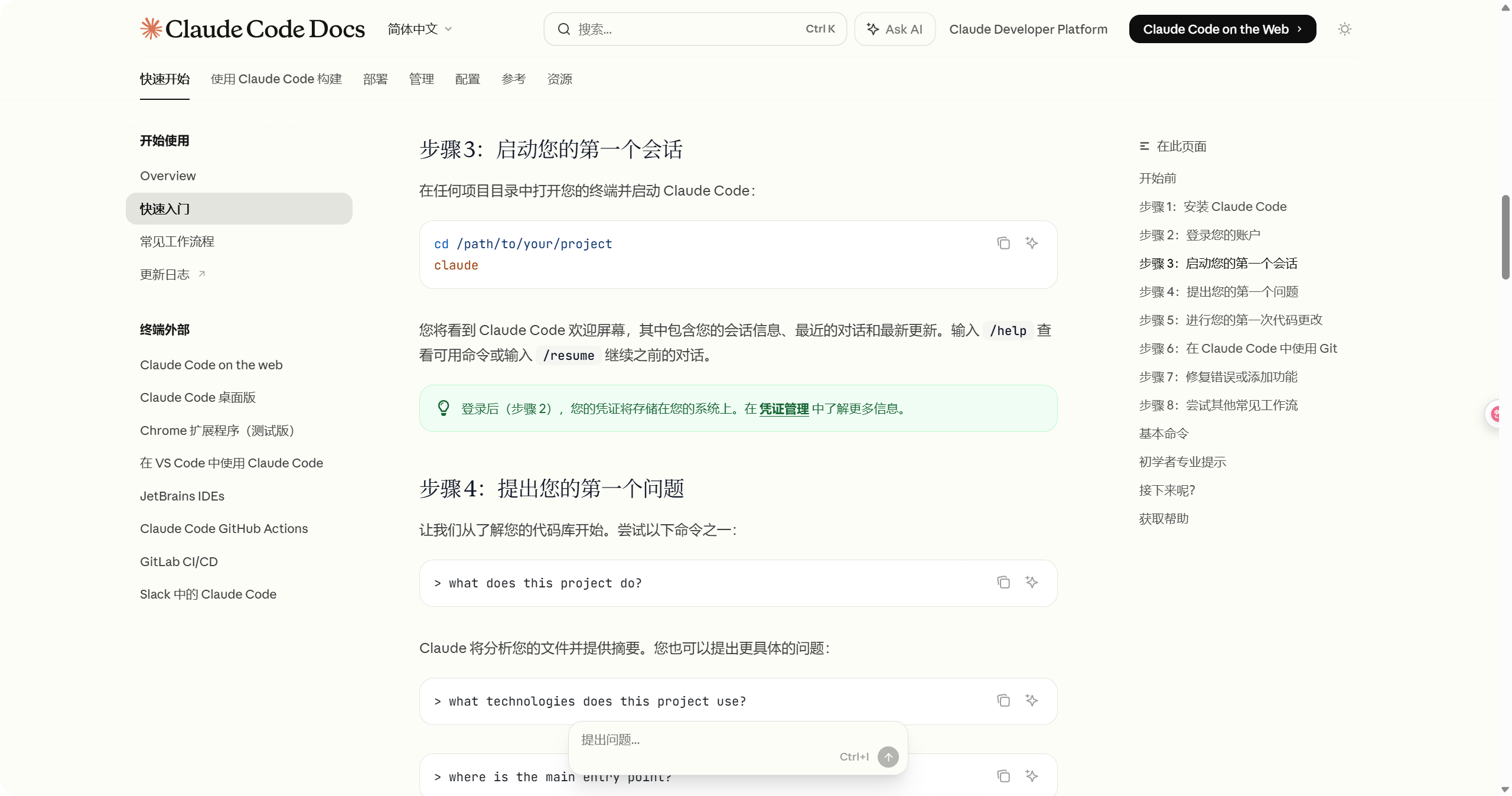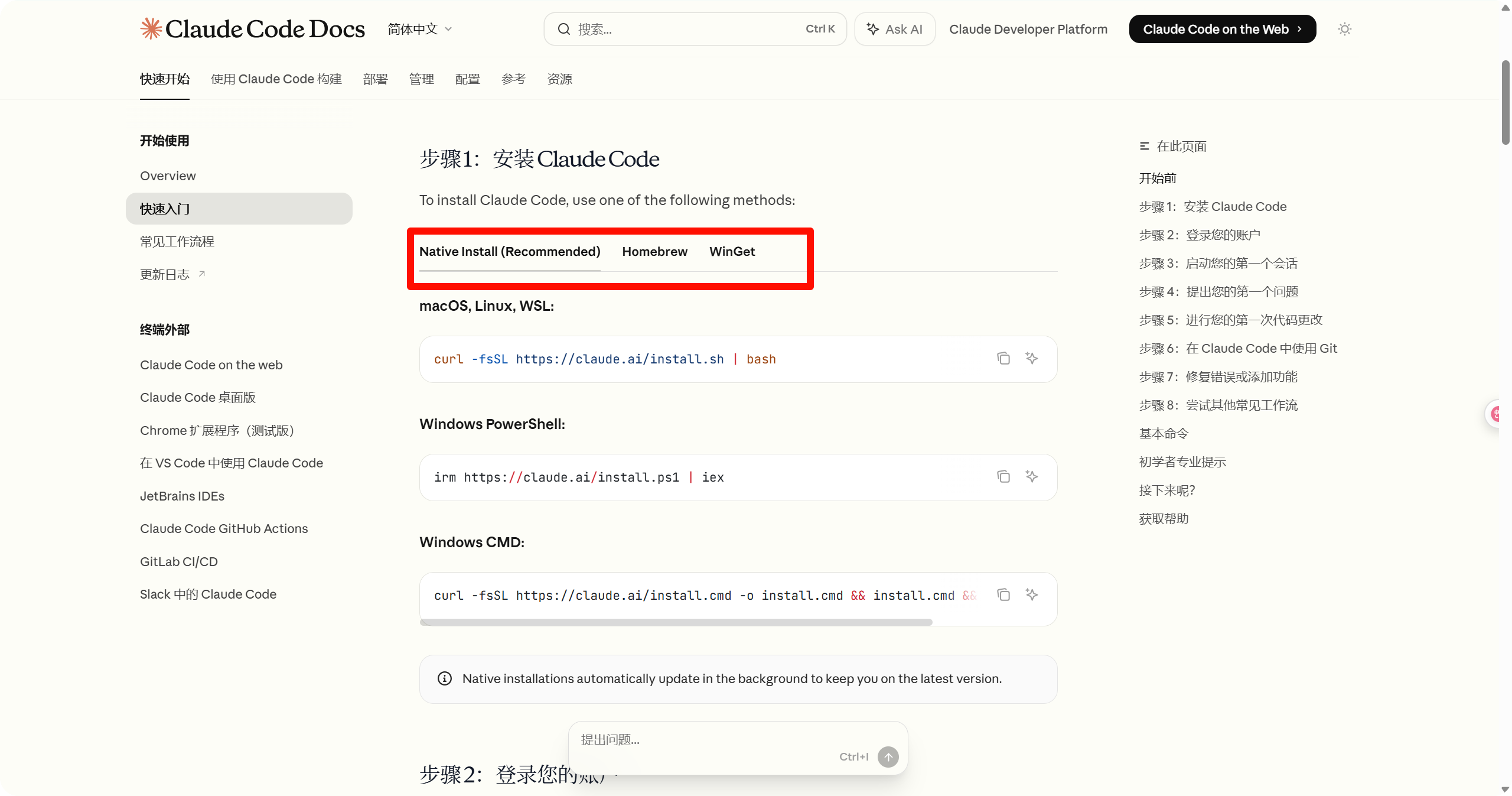 Windows 目前推荐 winget 安装。 打开 https://code.claude.com/docs/zh-CN/quickstart