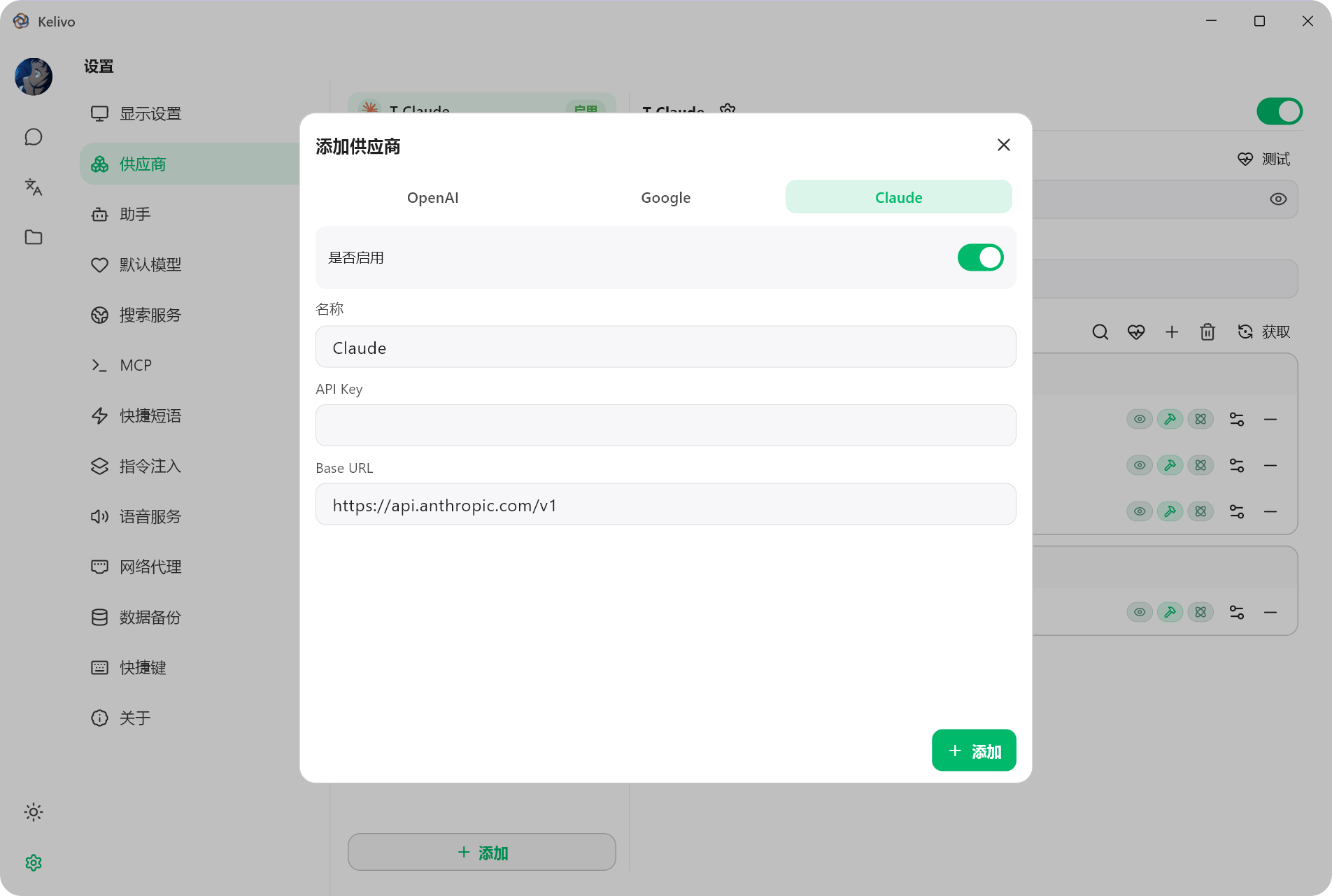 设置 - 供应商 - 添加供应商:选择 Claude